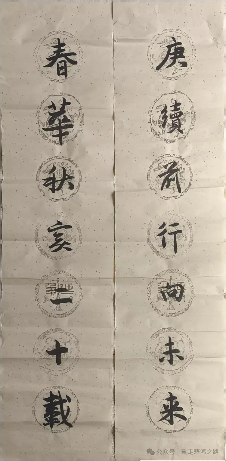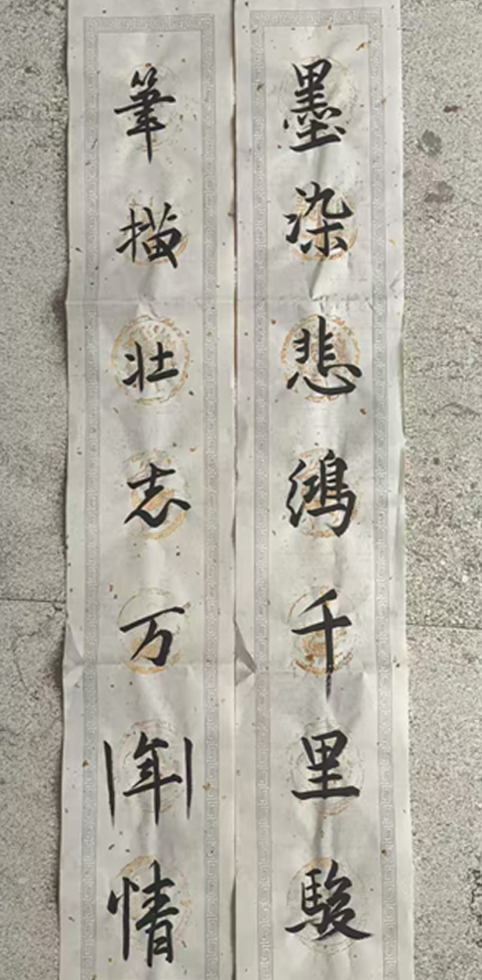 The first work is titled "Ink-Dyed by Zhehong for a Thousand Miles of Horses and Pen-Drawn for a Lifetime of Ambitions", created to commemorate the 130th anniversary of the birth of Xu Beihong. In terms of content, the upper line borrows the anecdote of Xu Beihong's painting of horses to depict the posture of a thousand-mile horse with ink, which is full of artistic appeal; the lower line expresses the sentiment through the pen, highlighting the ambition and embodying the eternal sentiment, creating an atmosphere of grandeur and deep affection.